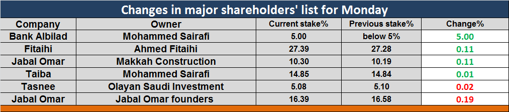 Riyadh-Mubasher: The major shareholders’ list of some companies listed on the Saudi stock market witnessed some changes on Monday, as shown in the following table: