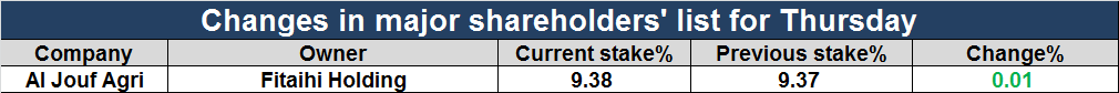 Riyadh-Mubasher: The major shareholders' list of Al Jouf Agricultural Development has witnessed some changes on Thursday, as shown in the following table: