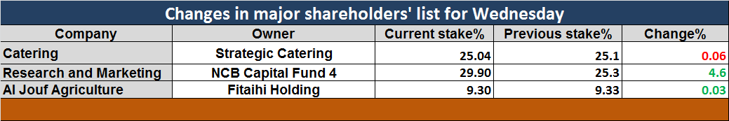 Riyadh-Mubasher: The major shareholders’ list of some companies listed on the Saudi stock market witnessed some changes on Wednesday, as shown in the following table: