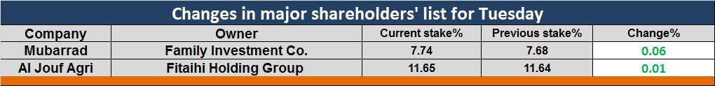 Riyadh-Mubasher: The major shareholders’ list of some companies listed on Tadawul witnessed some changes on Tuesday, as follows: