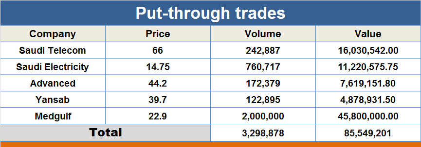 Riyadh-Mubasher: The Saudi bourse witnessed on Monday put-through transactions on Saudi Telecom, Saudi Electricity, Advanced Petrochemical, Yansab and Medgulf at a total value of SAR 85.5 million.