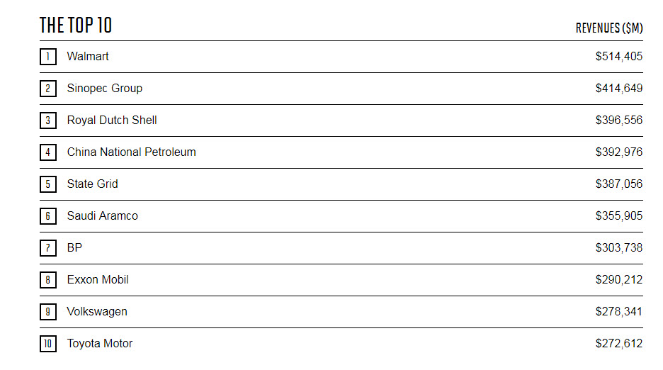 US’ Walmart topped the list, with $514 billion revenue, followed by China’s Sinopec Group and Royal Dutch Shell.