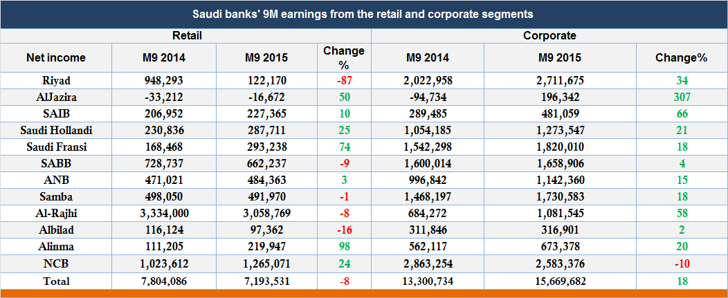 Riyadh-Mubasher: Combined earnings recorded by Saudi banks from the retail and corporate segments reached SAR 22.8 billion during the first nine months of 2015, a rise of 8% compared with SAR 21.1 billion a year earlier.
