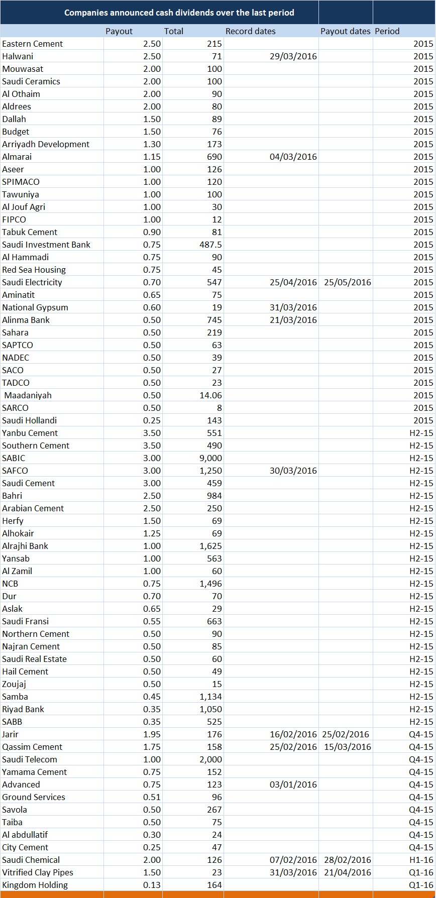 Saudi Vitrified Clay Pipes and Kingdom Holding announced cash dividends for the first quarter of 2016.