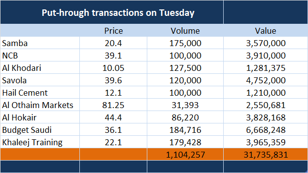 Riyadh-Mubasher: Saudi Stock Exchange (Tadawul) witnessed on Tuesday nine put-through transactions on the National Commercial Bank (NCB), Samba, Budget Saudi Arabia, Savola, Al Hokair, Al Khodari and Khaleej Training at a total value of SAR 31.7 million.