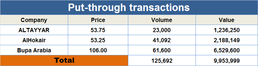 Riyadh-Mubasher: Saudi Arabia's stock market on Thursday witnessed put-through transactions on Al-Tayyar, Al-Hokair and Bupa Arabia at a total value of SAR 9.9 million.