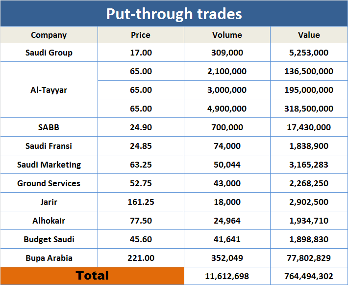 Riyadh-Mubasher: Saudi Arabia’s stock market executed on Monday put-through transactions at a total value of SAR 764.4 million.